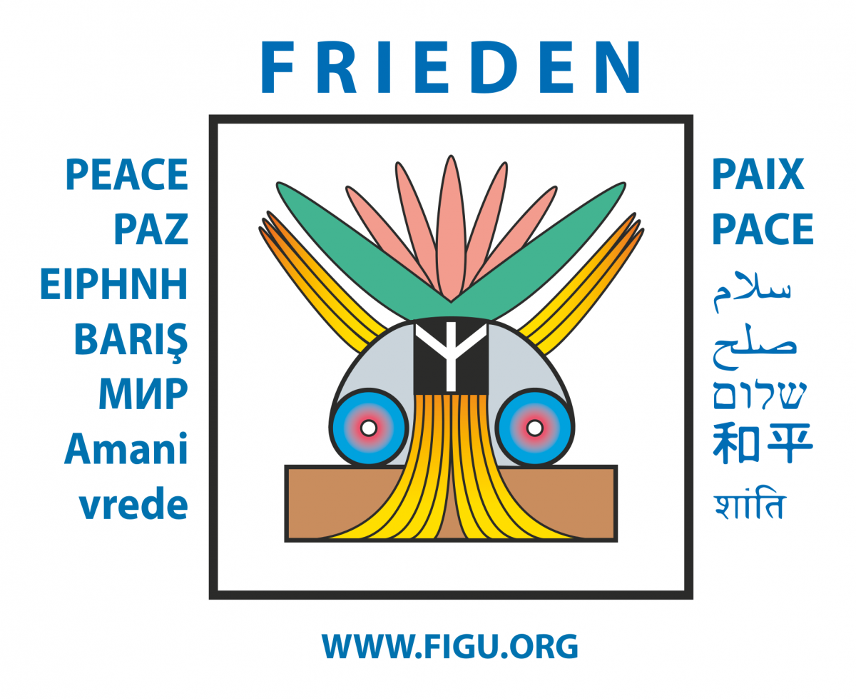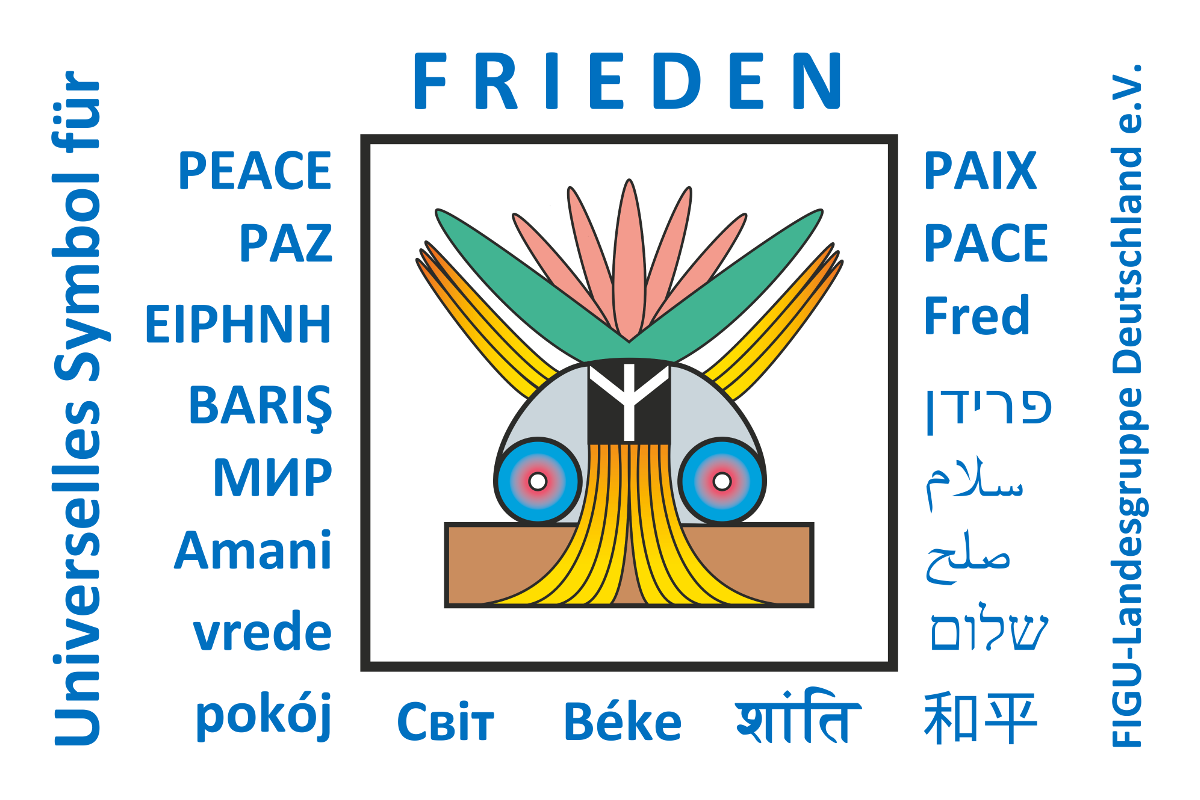 Rückseite mit «FRIEDEN richtiggestellt», dem quick-response code (QR-Code) zum Youtube-Video https://www.youtube.com/watch?v=T13ukch3xHs (Das wahre Friedenssymbol und warum die Friedensbewegung auf dem Kopf steht!) und dem Aufdruck «de.figu.org politikfrei, religionsfrei, eigenfinanziert, non-profit»;