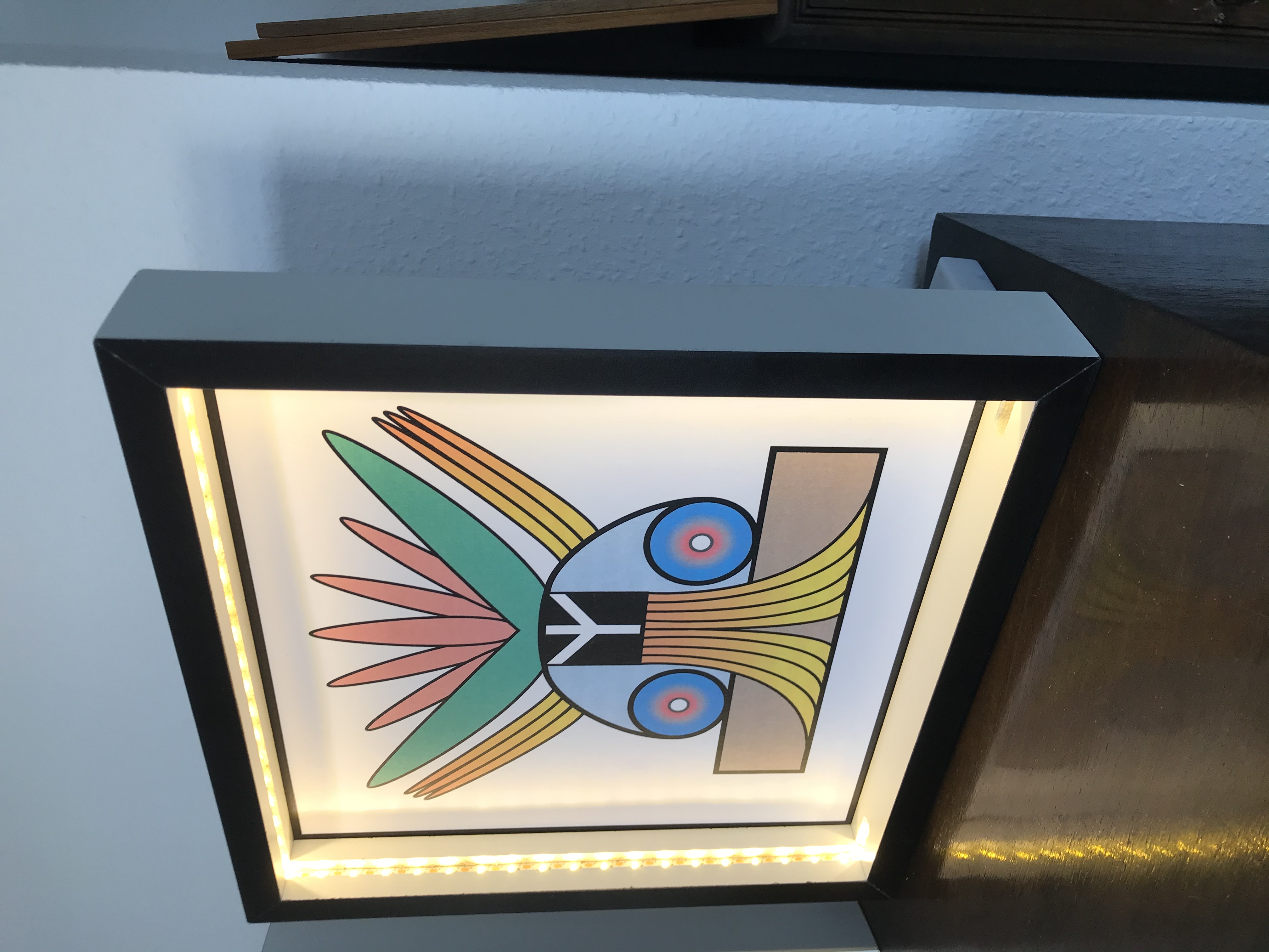 Grösse des Rahmens: 34,4 cm x 34,4 cm x 6 cm, ohne Glas, eingelassene LED-Beleuchtung im Rahmen, batteriebetrieben (3x 1,5 V Typ AA), Batteriekästchen rückwandig verstaubar,