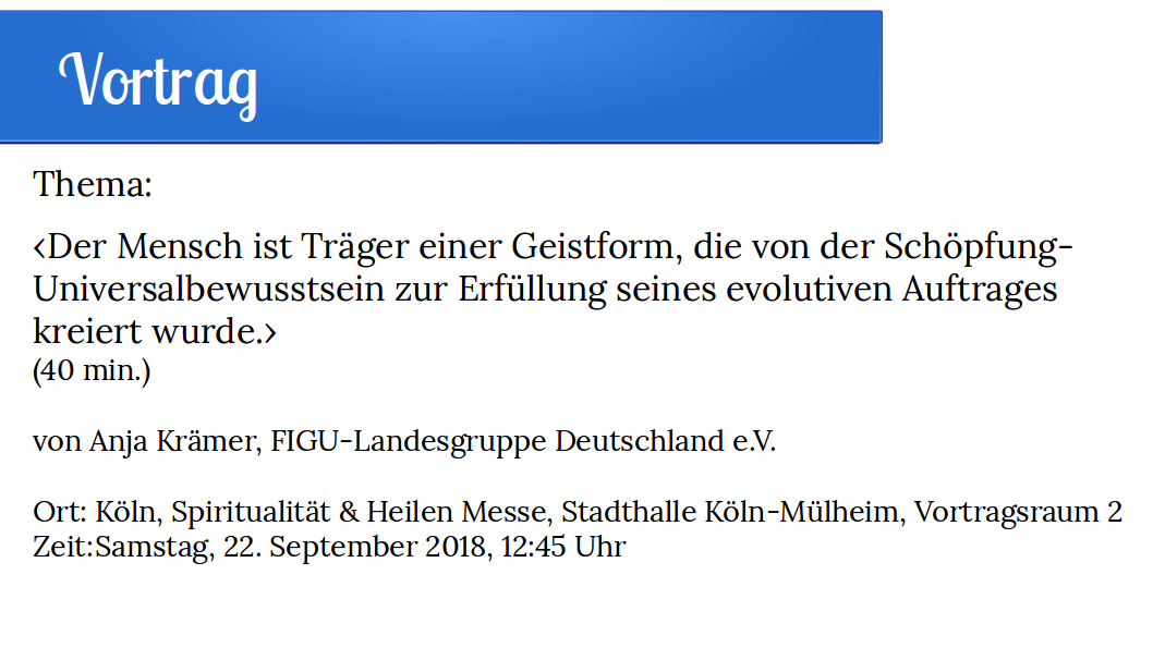 • ‹Der Mensch ist Träger einer Geistform, die von der Schöpfung-Universalbewusstsein zur Erfüllung seines evolutiven Auftrages kreiert wurde.› am Samstag, 12:45 h im Vortragsraum 2